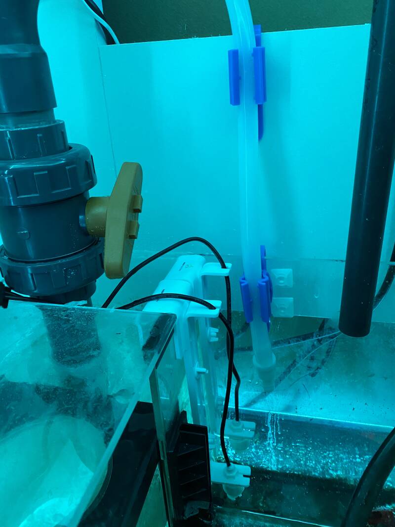 Zuerst habe ich versucht Klebesockel zu verwenden und diese mit handelsüblichen Kabelbindern an der Innenscheibe des Technikbeckens zu verkleben. Leider muss man schnell feststellen, dass die Temperatur und die permanente Feuchtigkeit sowie das Salz , jeglicher Art von Klebern extrem zusetzt.